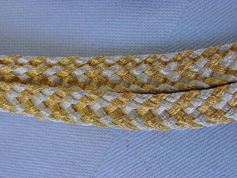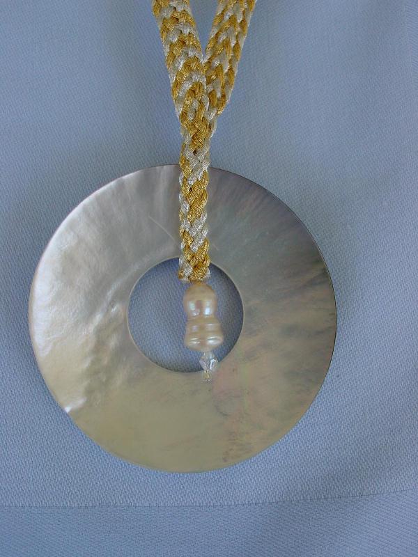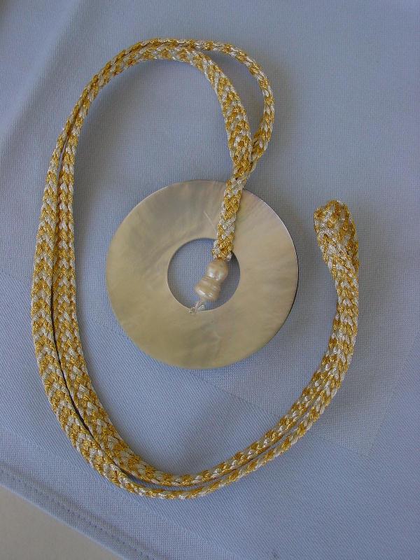 Die Medaille ist eine Muschel; in der Mitte befindet sich eine Tonnenperle (Süßwasser). Das Band ist Hira Yatsu Gumi, geflochten mit Byron Metallseide in gold und silber